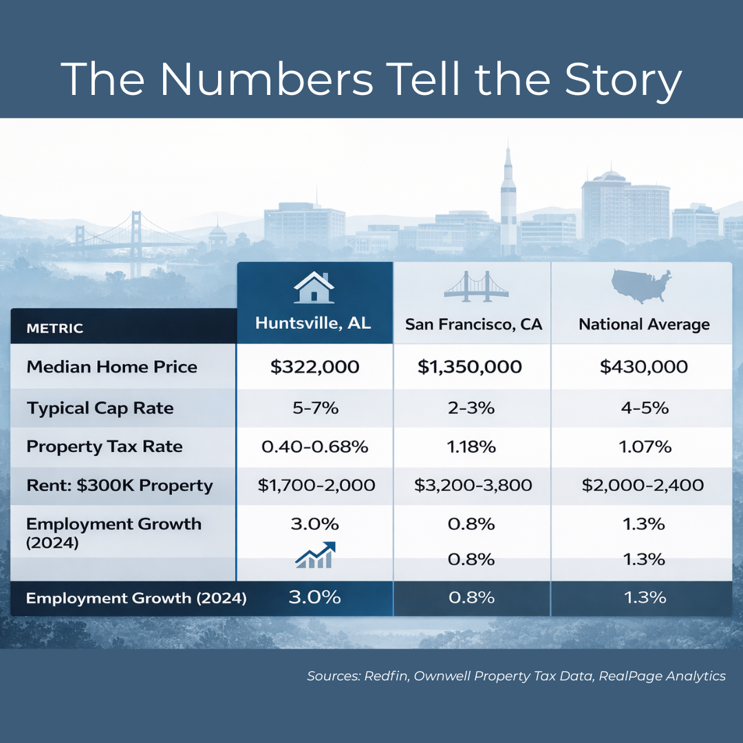 Investing in Huntsville real estate from out of state has become one of the most effective wealth-building strategies for investors nationwide. While coastal investors watch their $800,000 purchases barely break even, that same capital in Huntsville can acquire 2-3 cash-flowing properties with strong appreciation potential.