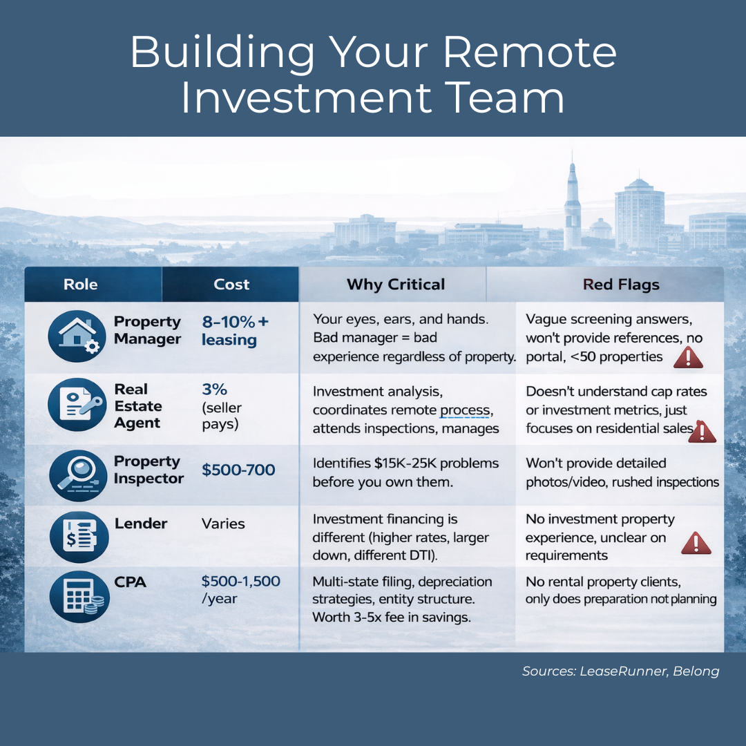 Critical insight: Most remote investors start by looking at properties. Wrong. Build your team first—especially your property manager relationship. Properties come and go. The right property manager determines your success for years.