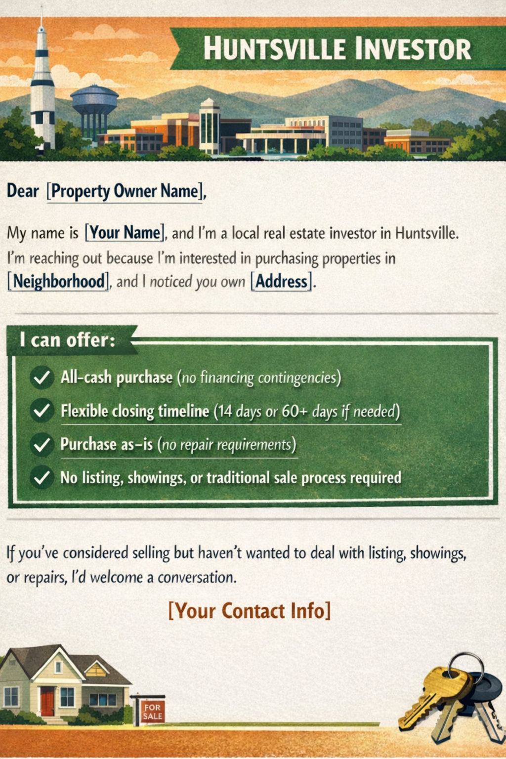 We've actually closed investment property transactions in Huntsville and Madison County. Our track record means sellers trust us to close quickly and professionally.